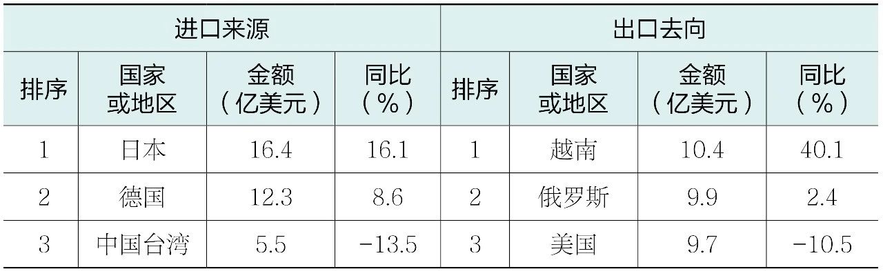 根据中国海关数据,机床工具商品进口来源和出口去向排名前三的情况,详见表5。