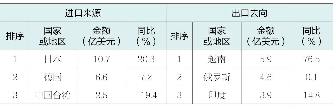 与今年一季度相比,金属加工机床进口来源和出口去向的前三位国家和地区及排序没有变化。